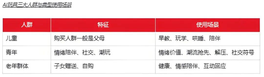 不同群体在购买和使用AI玩具时,需求和痛点不同。比如,Z世代给自己购买时,看重颜值与情绪价值;家长为儿童购买时,看重教育和安全;子女为长辈购买时,更看重实用性和操作方便。即使都是儿童,不同年龄段AI玩具需求也不同。