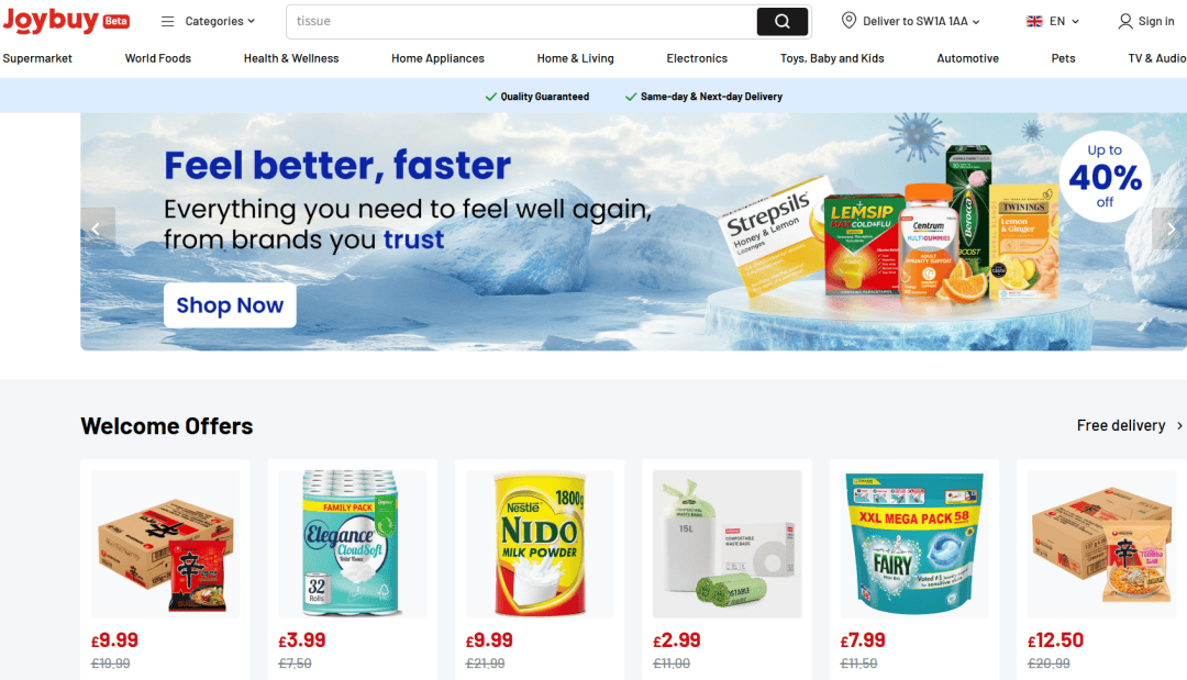 在自2024年下半年起(在伦敦进行封闭测试后扩展到英国多地及欧洲多国)的试运营期间,Joybuy推出了京东中国用户熟悉的电商核心服务,包括免运费门槛、30天免费退货以及新用户可享受的大幅折扣,比如:首单价格低至零售价的10%(90%折扣)及推荐优惠券。更重要的是,Joybuy利用京东强大的物流实力,在英国提供快速配送服务。目前,Joybuy在英国多个城市提供次日达服务,甚至在部分地区(尤其是大伦敦地区)提供当日达服务。