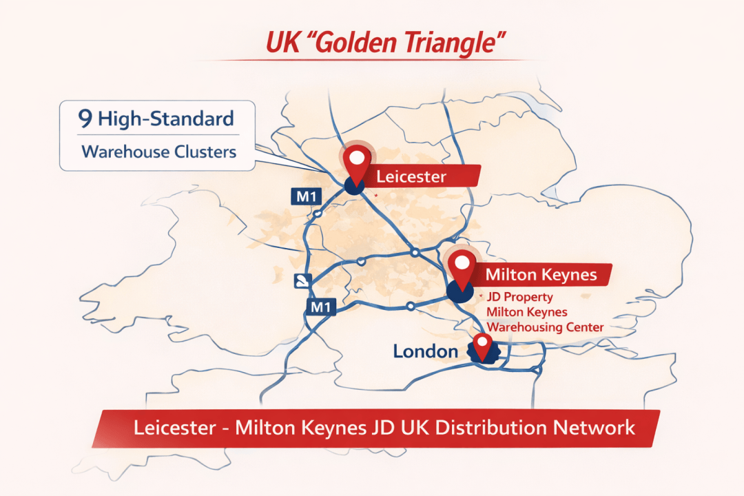 除了这座旗舰仓库外,京东还在英国构建了更为广泛的物流网络。在英国,京东围绕英格兰中部(Midlands)物流“黄金三角”加码仓配网络:其已披露的关键落点包括near Leicester,East Midlands(连接M1–M69的干线走廊)以及Milton Keynes等中部节点。京东产发称,随着莱斯特项目落地,其在黄金三角区已完成9大高标准仓储集群布局,并借助“4小时覆盖英国90%人口”的区位优势,提升英国境内的区域配送效率。
